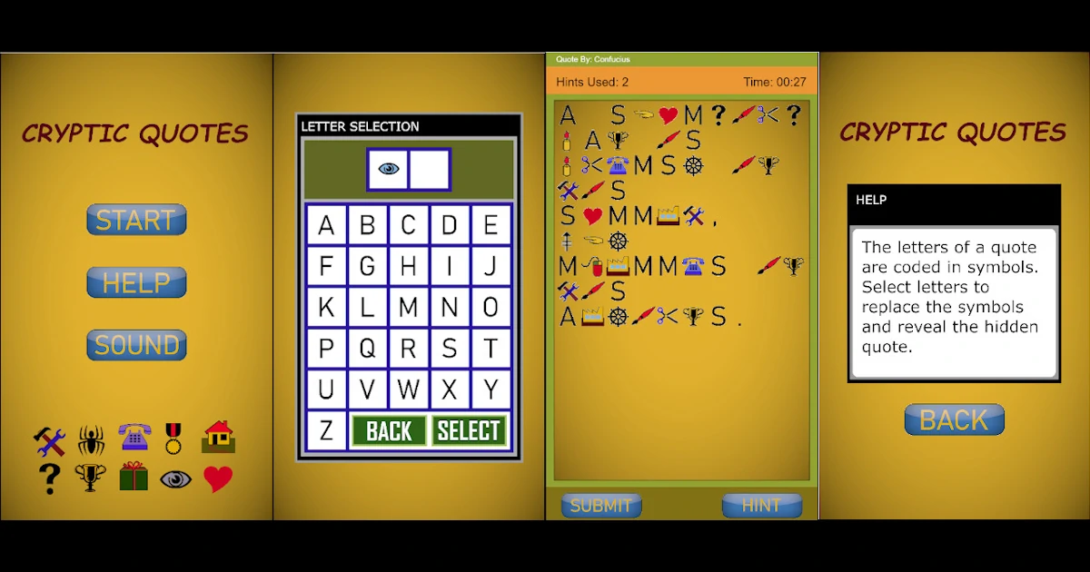 Hidden Quotes Game info Description: The letters of a randomly selected famous quote are coded in symbols. Your goal is to select the correct letters and reveal the hidden quote.*mouse* = Left Click on a symbol to replace it with a letter. PLAY NOW!