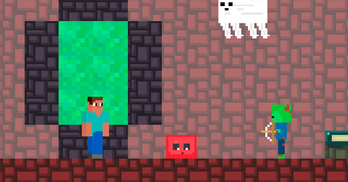You have to help the cute steven go through the portal and reach the green chest in the red dark. come on what are you waiting for help and make steve reach the ballot box. Be careful now, more dangerous flying monsters, slime walking on the ground and zombies shooting arrows are waiting for you.